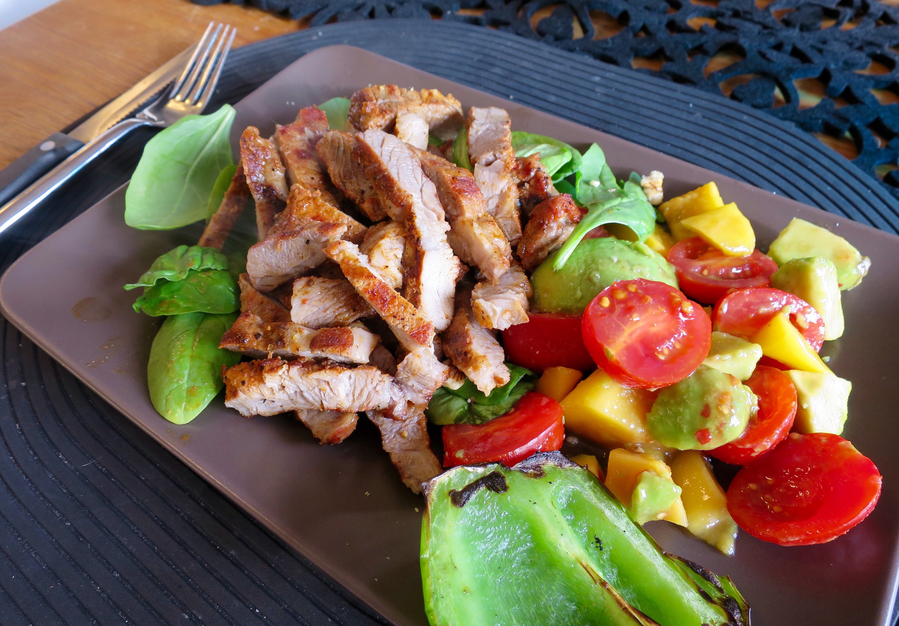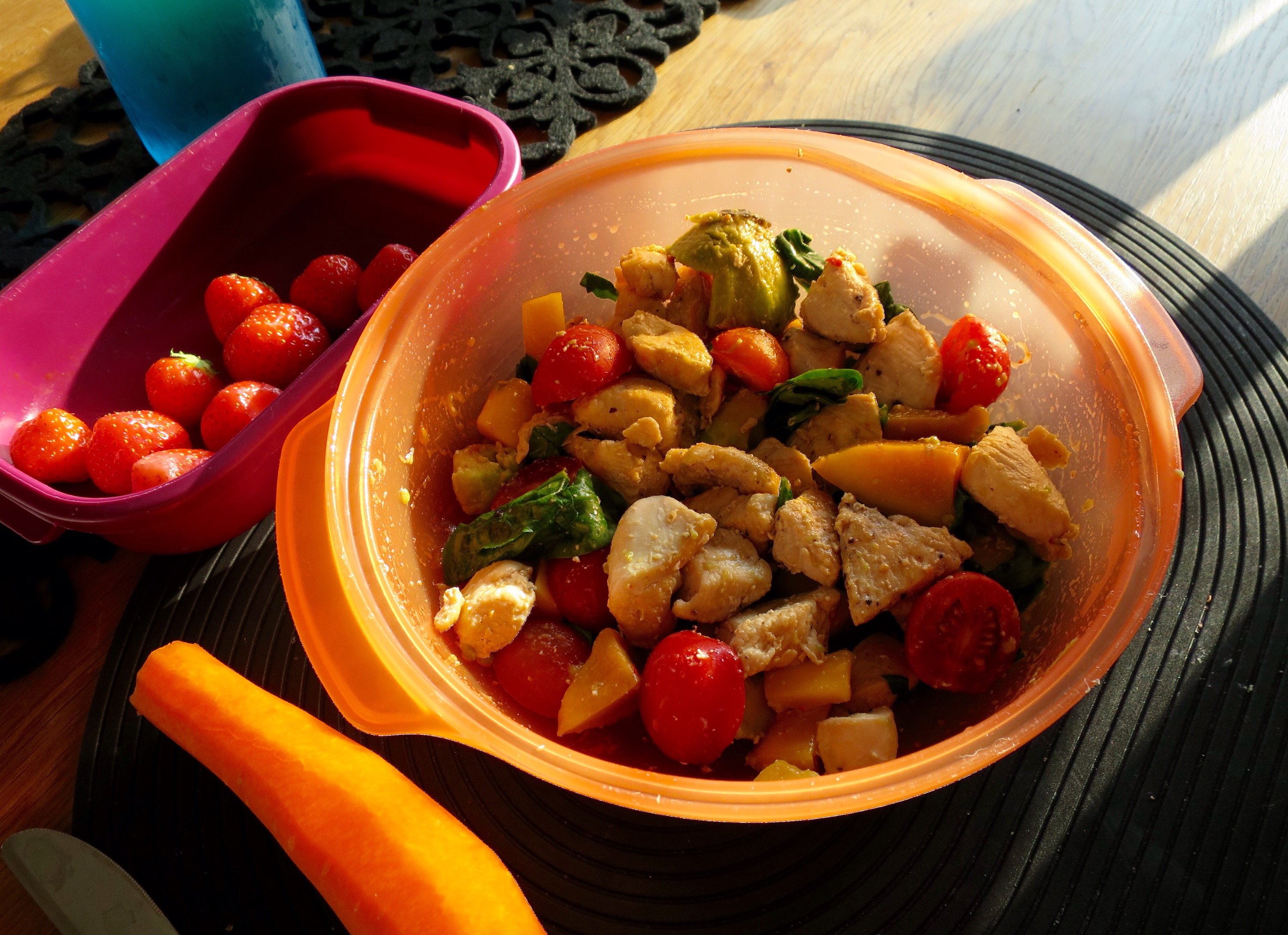 Min middag för hela veckan. 200g kyckling mixat med acokado, tomat, mango och spenat. Lite citronsaft och sambal för extra sting!
