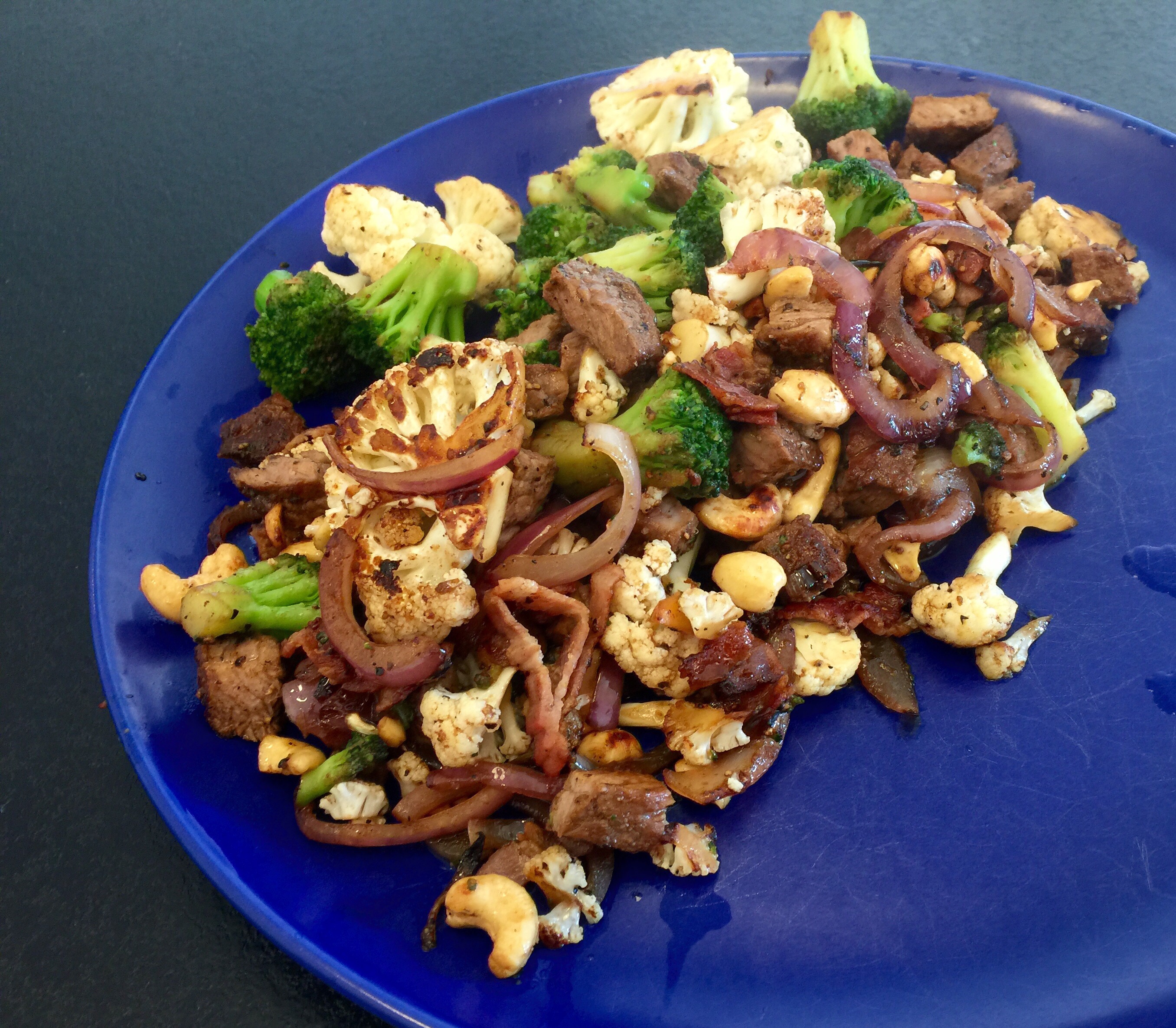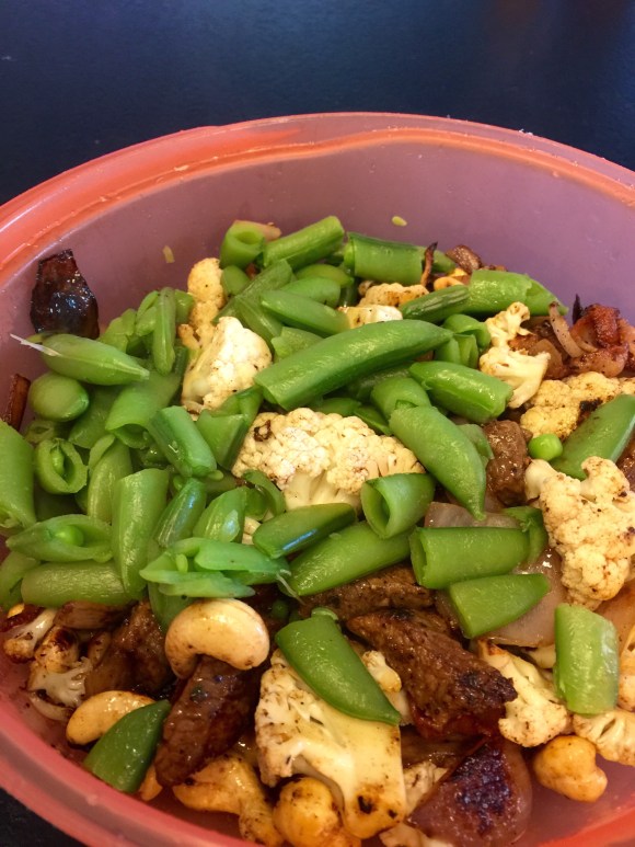 Stek bacon och lök och blomkål i kokosfett. Tärna upp färdiggrillad kött och värm broccoli eller sockerärtor i micron. Baam kött, grönsaker och fett rätt ut i systemet!